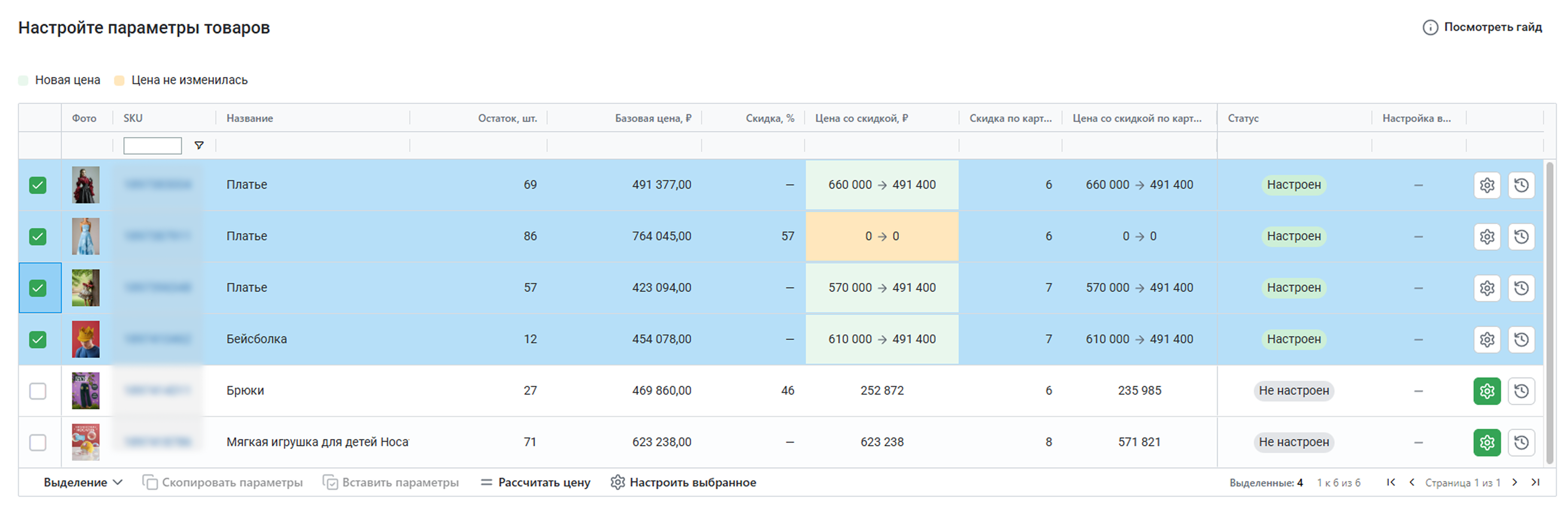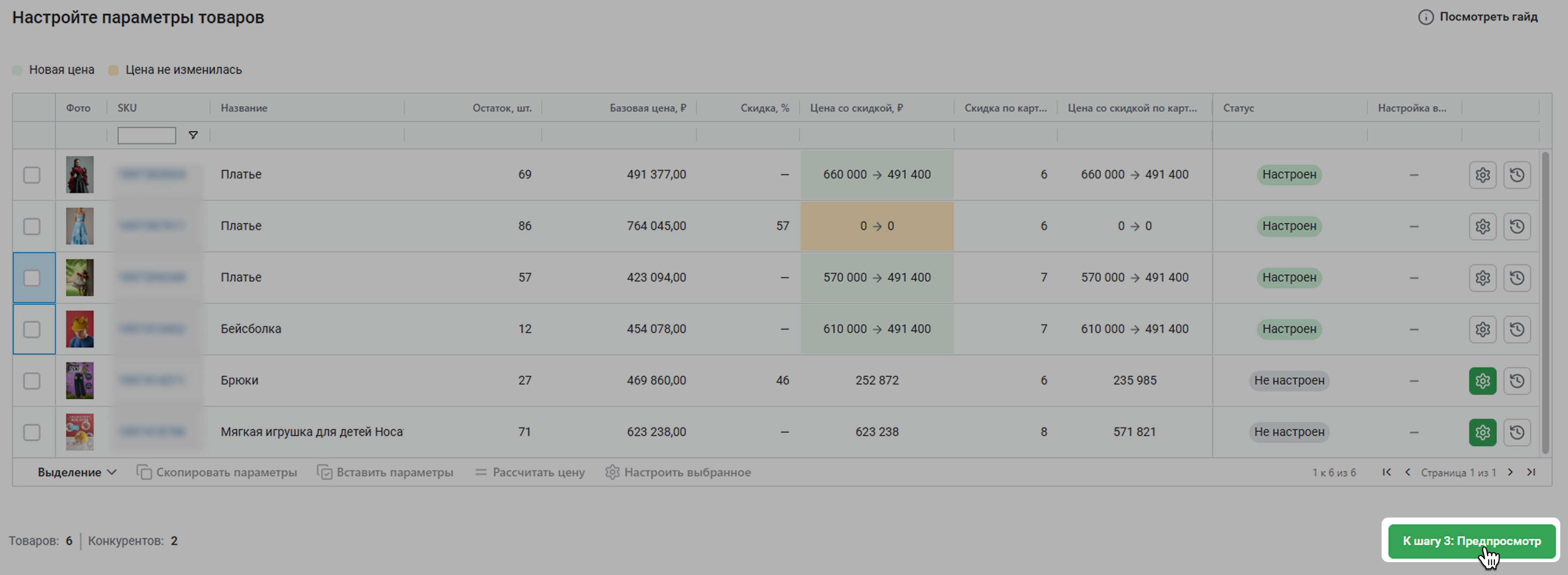 Репрайсер пересчитает цены на товары с учетом всех настроек и покажет новую и старую цены в сравнении. Если текущая и новая цены совпадут, мы предупредим об этом. Еще после расчета у товара появится статус Настроен – это значит, что репрайсер готов управлять ценой товара на Wildberries.