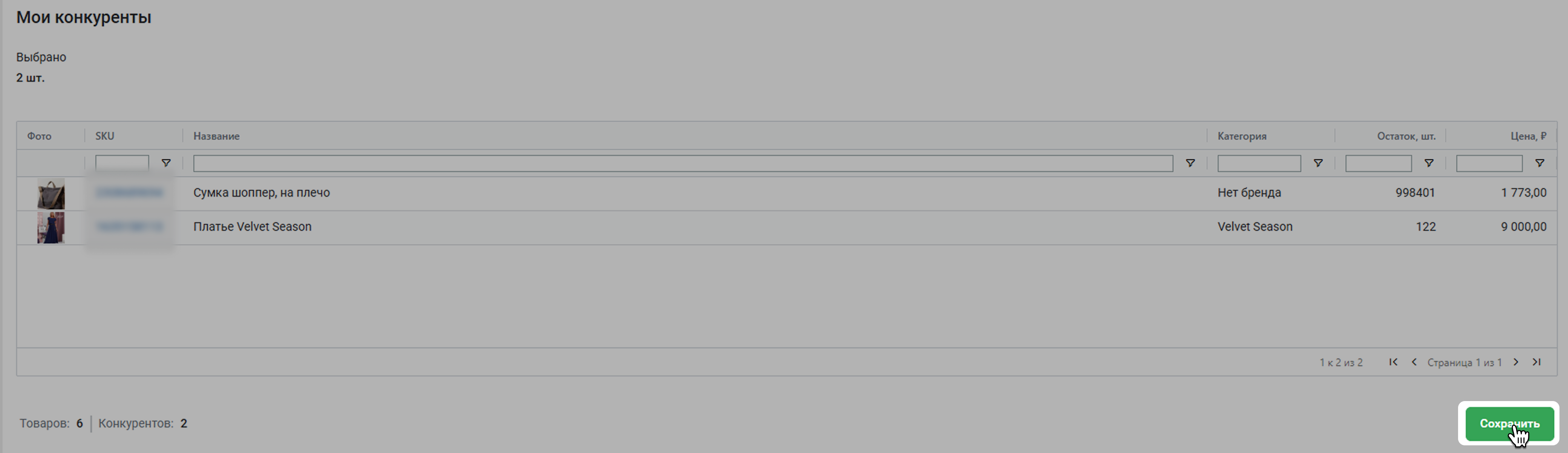 Введите интересующие вас SKU в текстовое поле в блоке Товары конкурентов и нажмите Добавить.