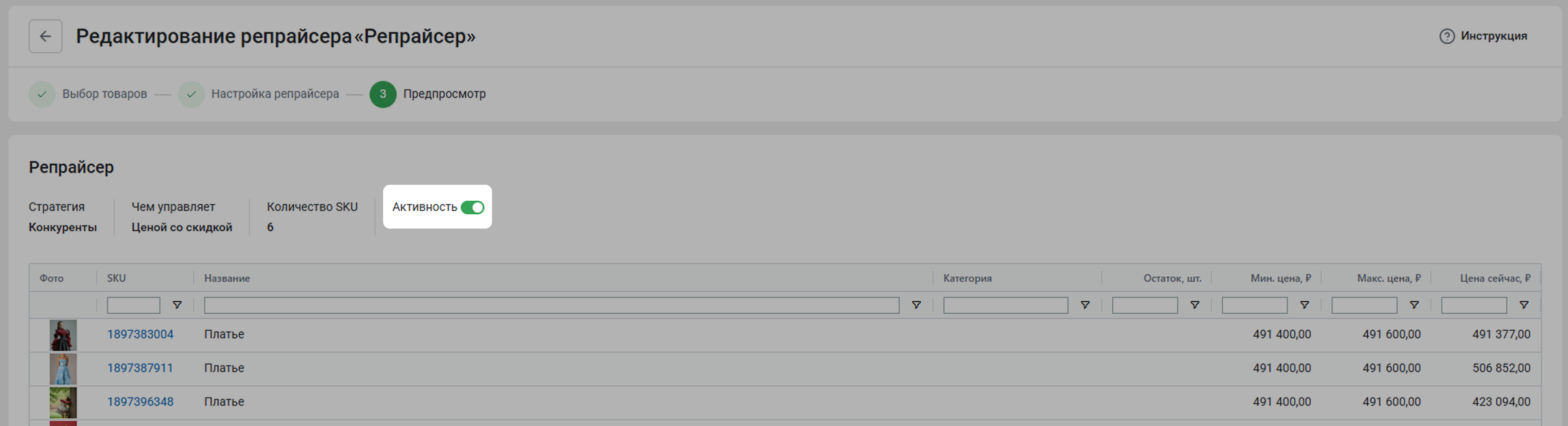 Проверьте, что все настроено правильно. Активируйте переключатель Активность, чтобы репрайсер начал управлять ценами на Ozon. Можно оставить выключенным, если нужно сохранить настройки и запустить репрайсер позже.