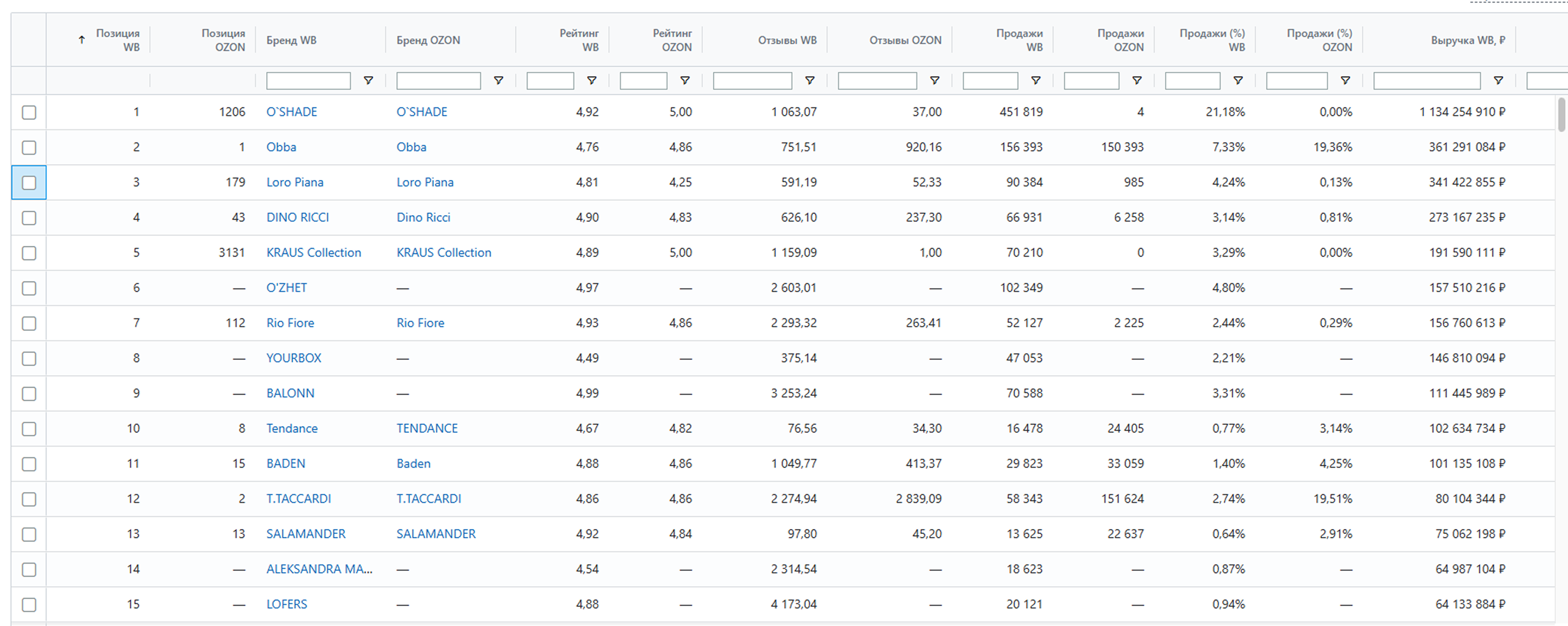 Выберите маркетплейс, по которому хотите посмотреть рейтинг – Wildberries или Ozon. Бренды в таблице отсортируются по выручке.