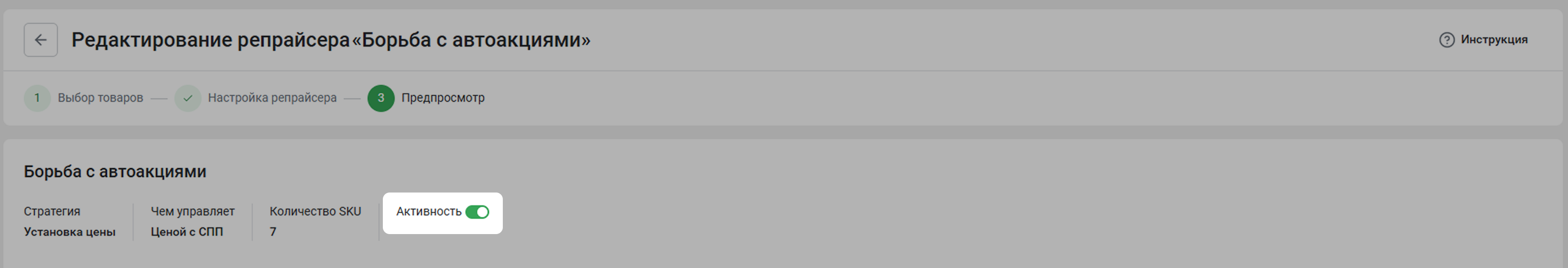 Репрайсер можно запустить, даже если в нем настроены не все товары – у него будет статус Черновик. Если активировать такой репрайсер, он будет управлять только товарами со статусом Настроен