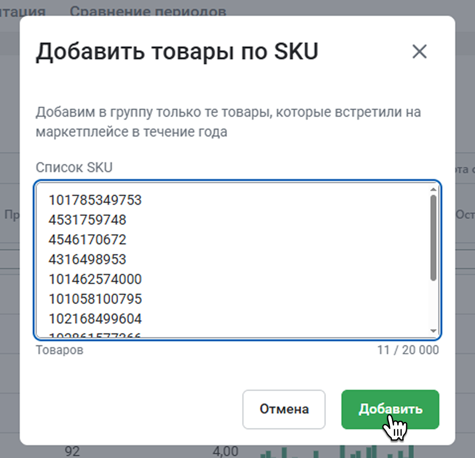 Введите интересующие вас SKU через пробел, точку с запятой или каждый с новой строки. В одну группу можно добавить до 100 000 товаров. Но за один раз можно добавить не больше 20 000 товаров – количество добавленных товаров указано внизу. Нажмите Добавить.