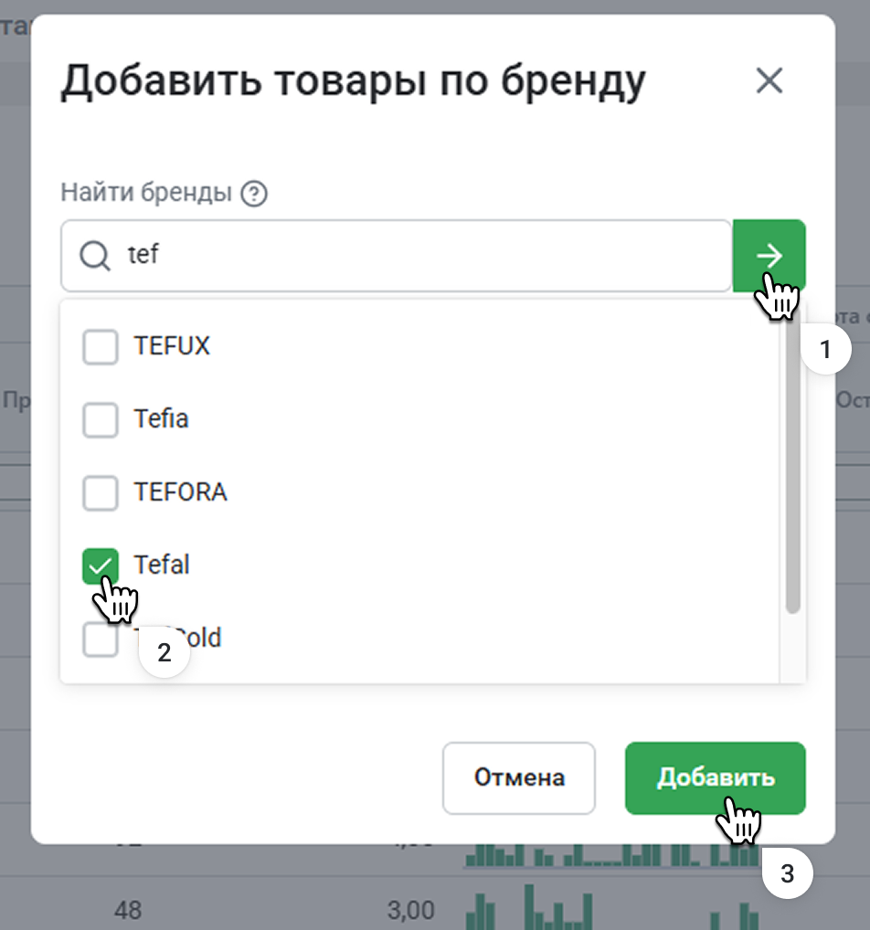 Введите название бренда частично или целиком. Нажмите на стрелочку или Enter. Система предложит вам подходящие варианты брендов. Отметьте нужные галочками и нажмите Добавить.