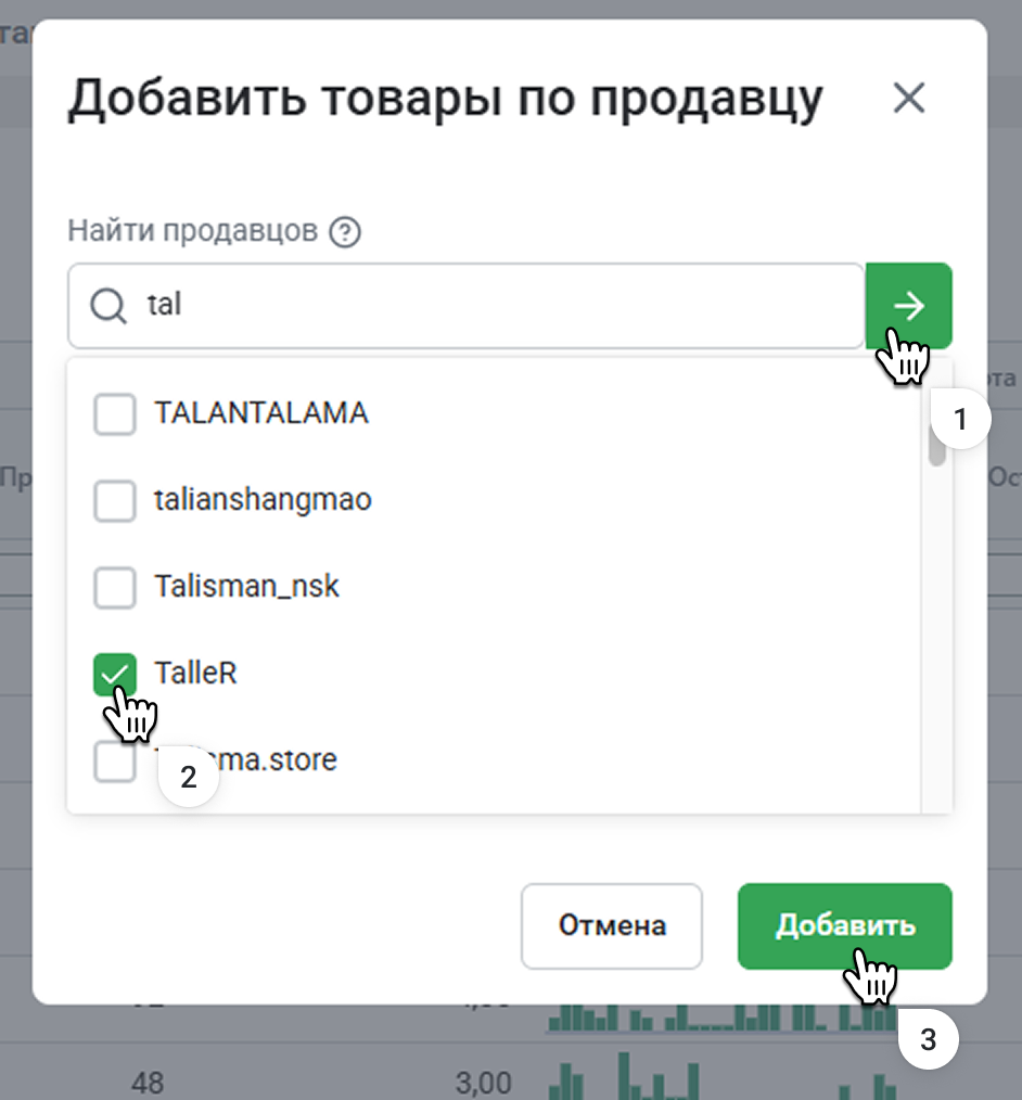 Введите название продавца частично или целиком. Нажмите на стрелочку или Enter. Покажем вам подходящие под ваш запрос варианты. Отметьте нужных продавцов галочками и нажмите Добавить.