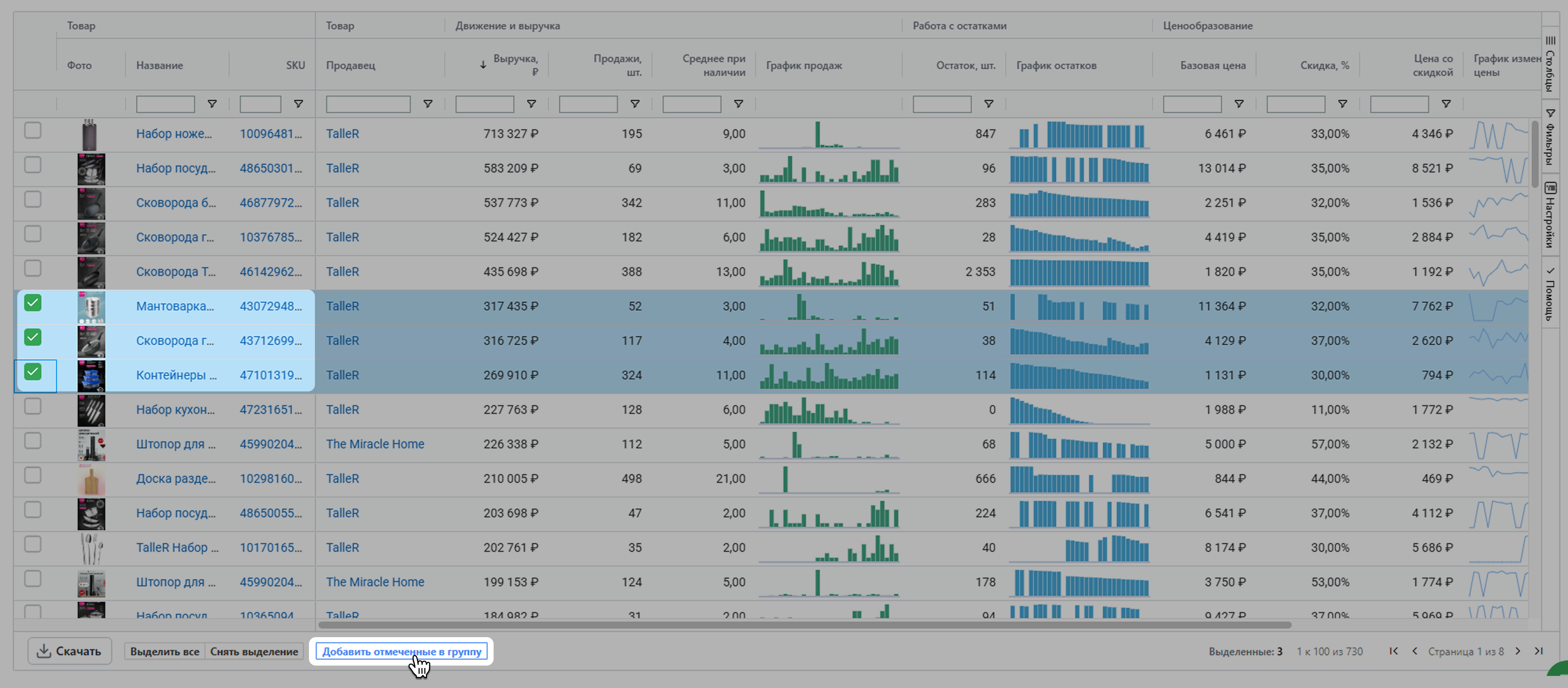 Перейдите в отчет по Категориям, отчет по Продавцу или отчет по Бренду на вкладку Товары. Отметьте галочками товары и нажмите Добавить отмеченные в группу.