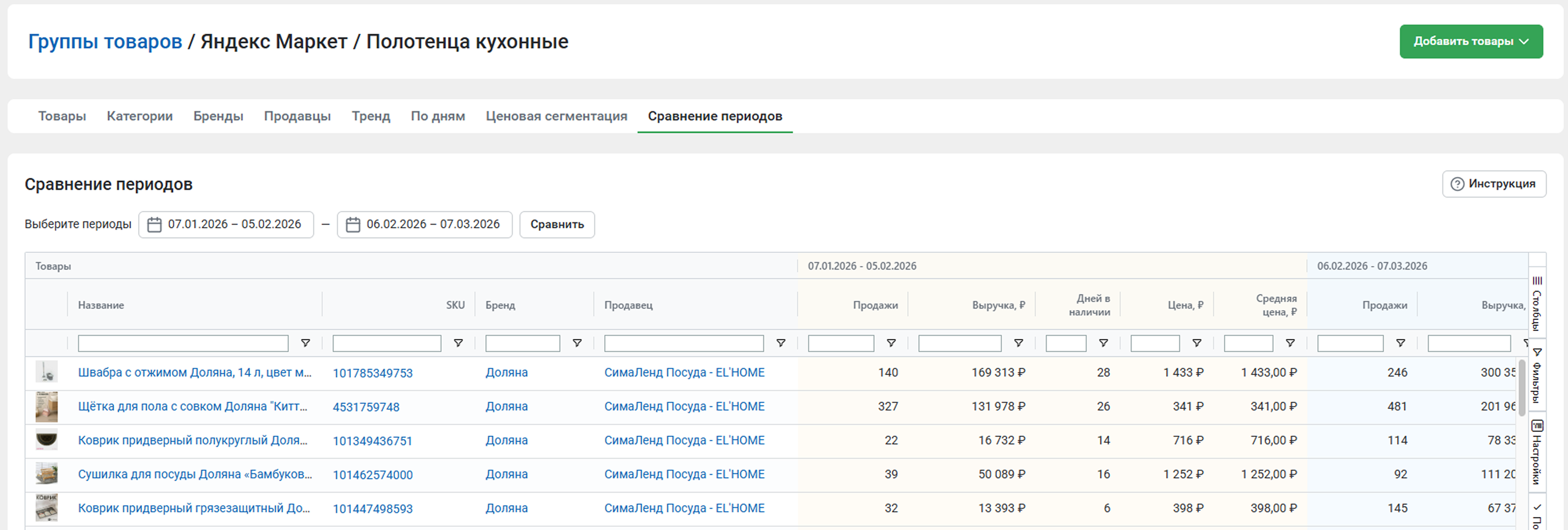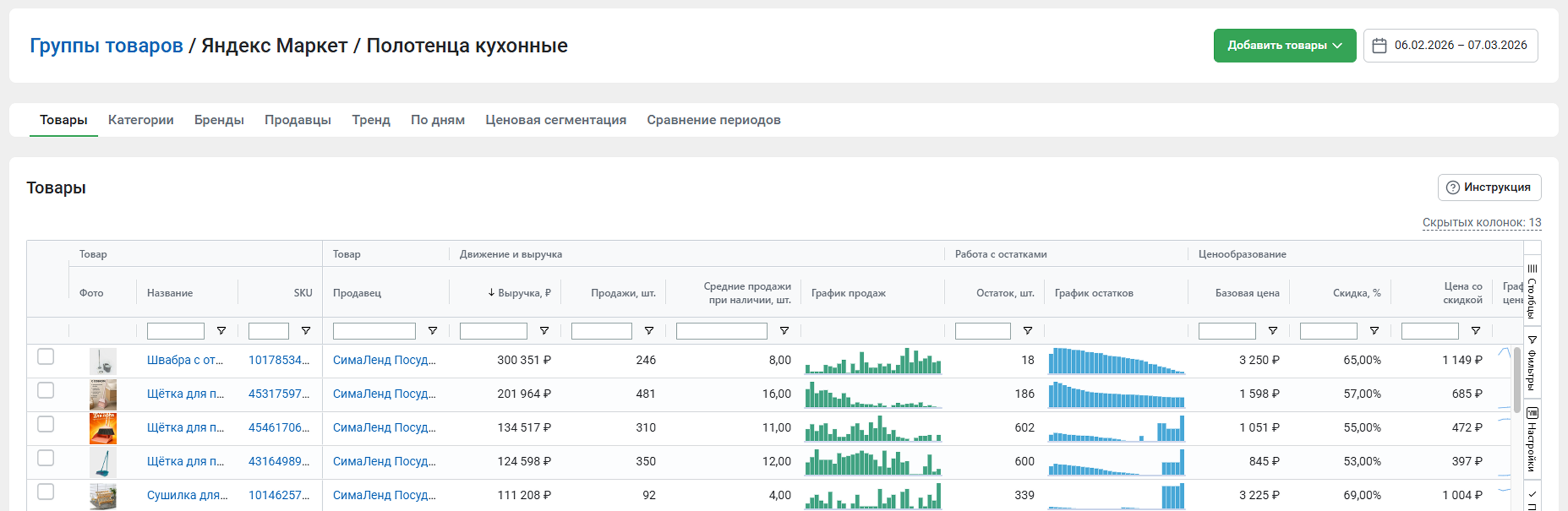 Иногда возникает необходимость сделать выборку товаров, объединенных общими признаками. Например, когда вы проводите конкурентный анализ общих категорий вроде Товары для дома / Хозяйственные товары / Товары для ухода за одеждой и бельем, в них встречаются разные виды товаров: машинки для удаления катышков, сушилки, швейные машины. Для удобства анализа вы можете объединить товары при помощи инструмента Группы.