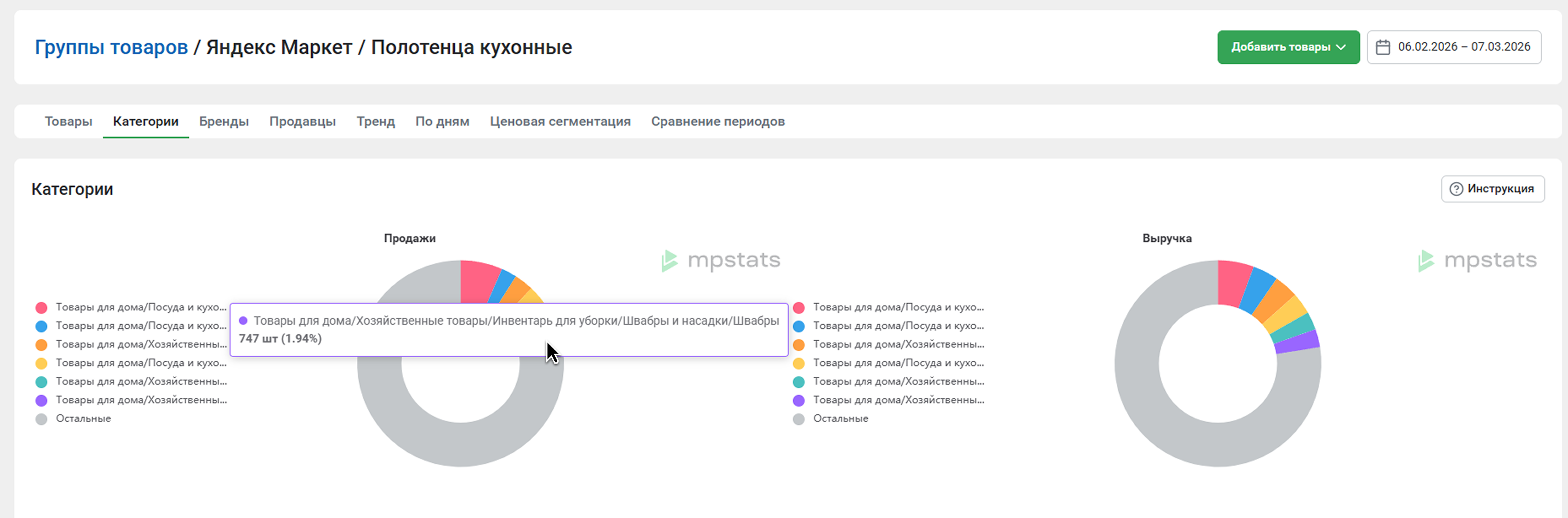 Отчет поможет понять, в каких категориях представлены товары в группе и где больше или меньше товаров. Если вы наведете курсор на диаграмму, увидите долю продаж и выручки в конкретной категории товаров в группе. Более подробно можно прочитать в статье Категории.