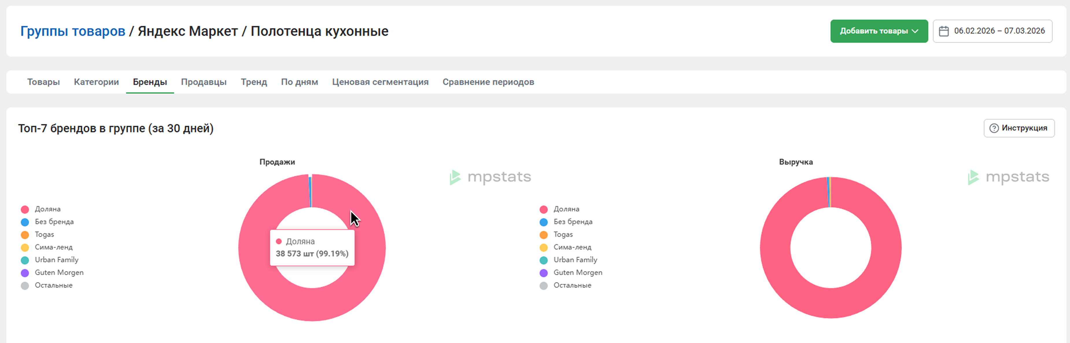 Диаграмма показывает, какая доля продаж и выручки приходится на каждого продавца в группе. Еще с ее помощью легко выявить и исследовать потенциальных конкурентов.