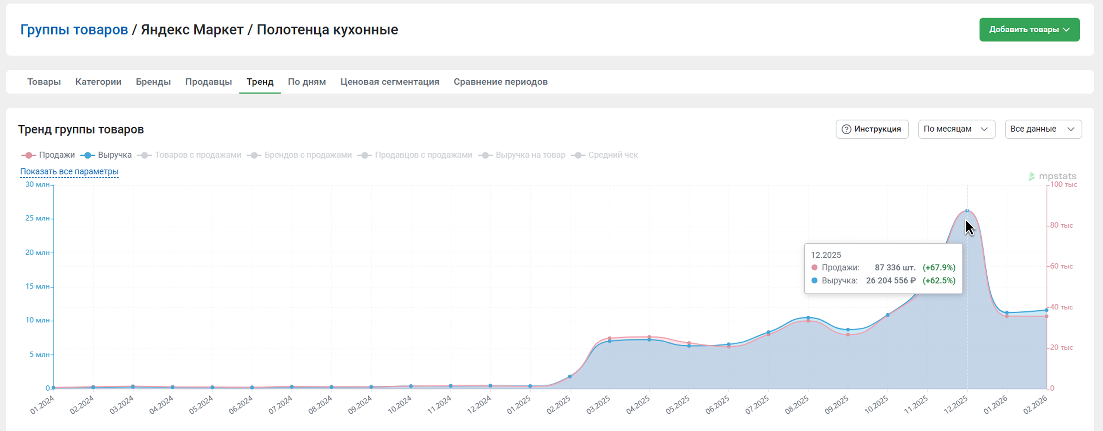 График отражает динамику рассматриваемой категории в выбранном периоде и помогает понять, в какие моменты происходил рост или спад продаж. Если навести курсор на конкретный участок графика, покажем информацию о выручке, упущенной выручке и продажах для этого периода. Подробнее об инструменте рассказали статье Тренд.