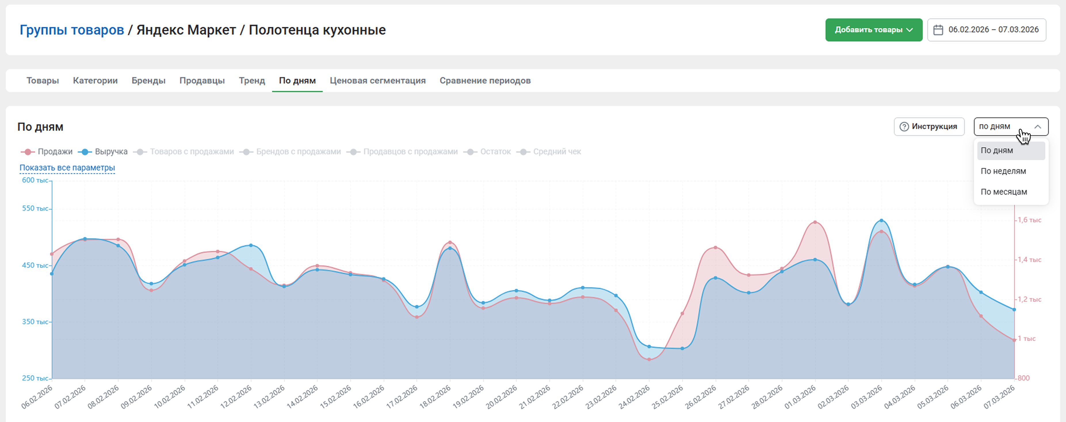 Вы можете просматривать график по дням, по неделям или по месяцам. Подробнее об инструменте можно прочитать в статье По дням.