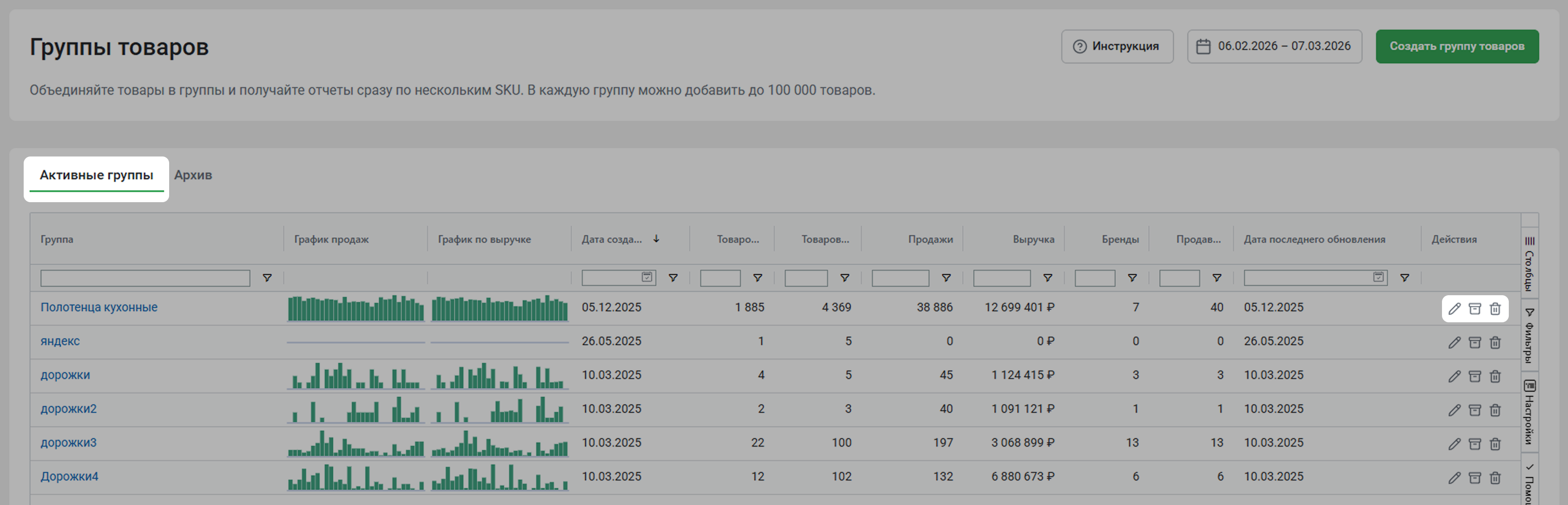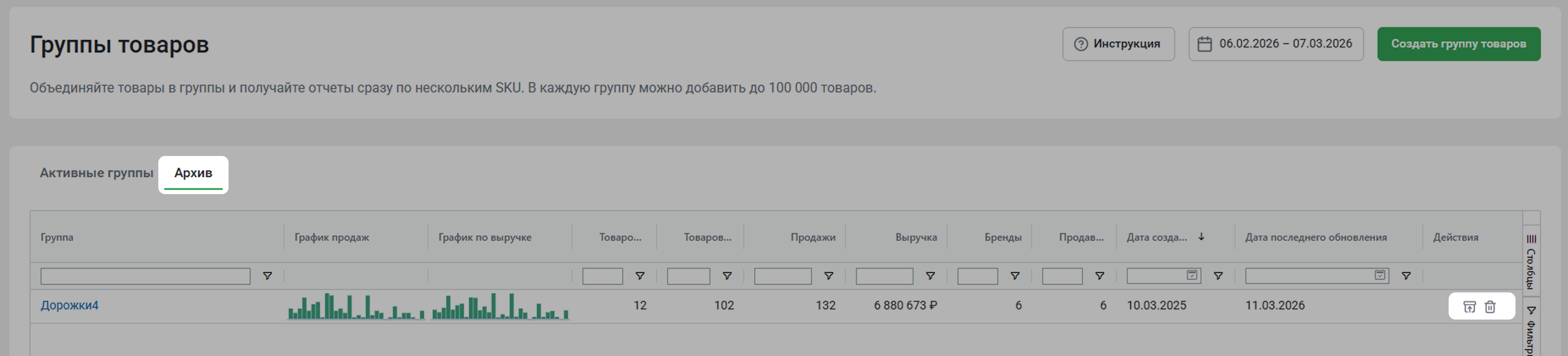Группы, которые не нужны вам сейчас, но могут понадобиться в будущем, можно отправить в Архив. Здесь тоже будут все основные показатели. Группу из Архива можно восстановить или удалить. Если вернуть группу в Активную, информация по ней будет доступна за все дни, включая те, пока она была в архиве.