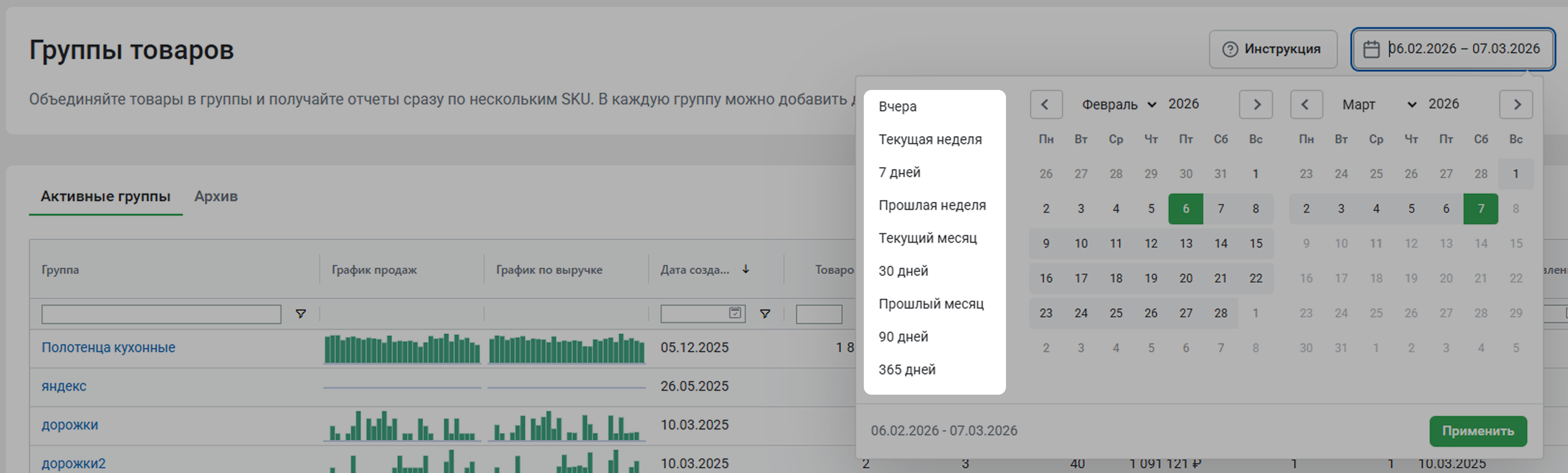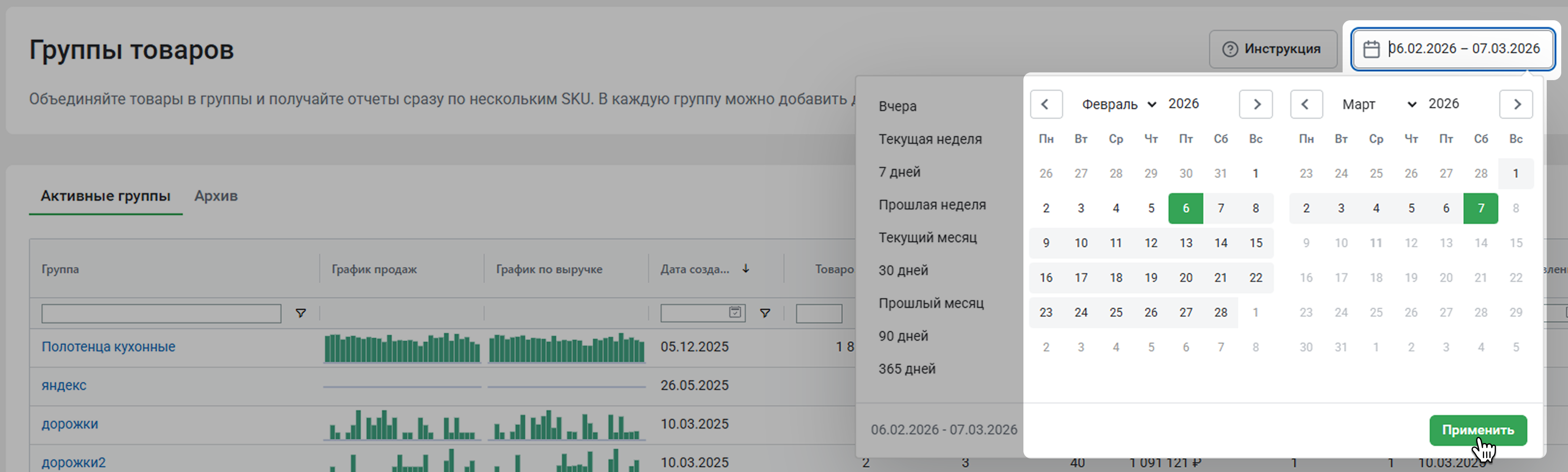 Чтобы выбрать период отчета, нажмите на значок календаря.