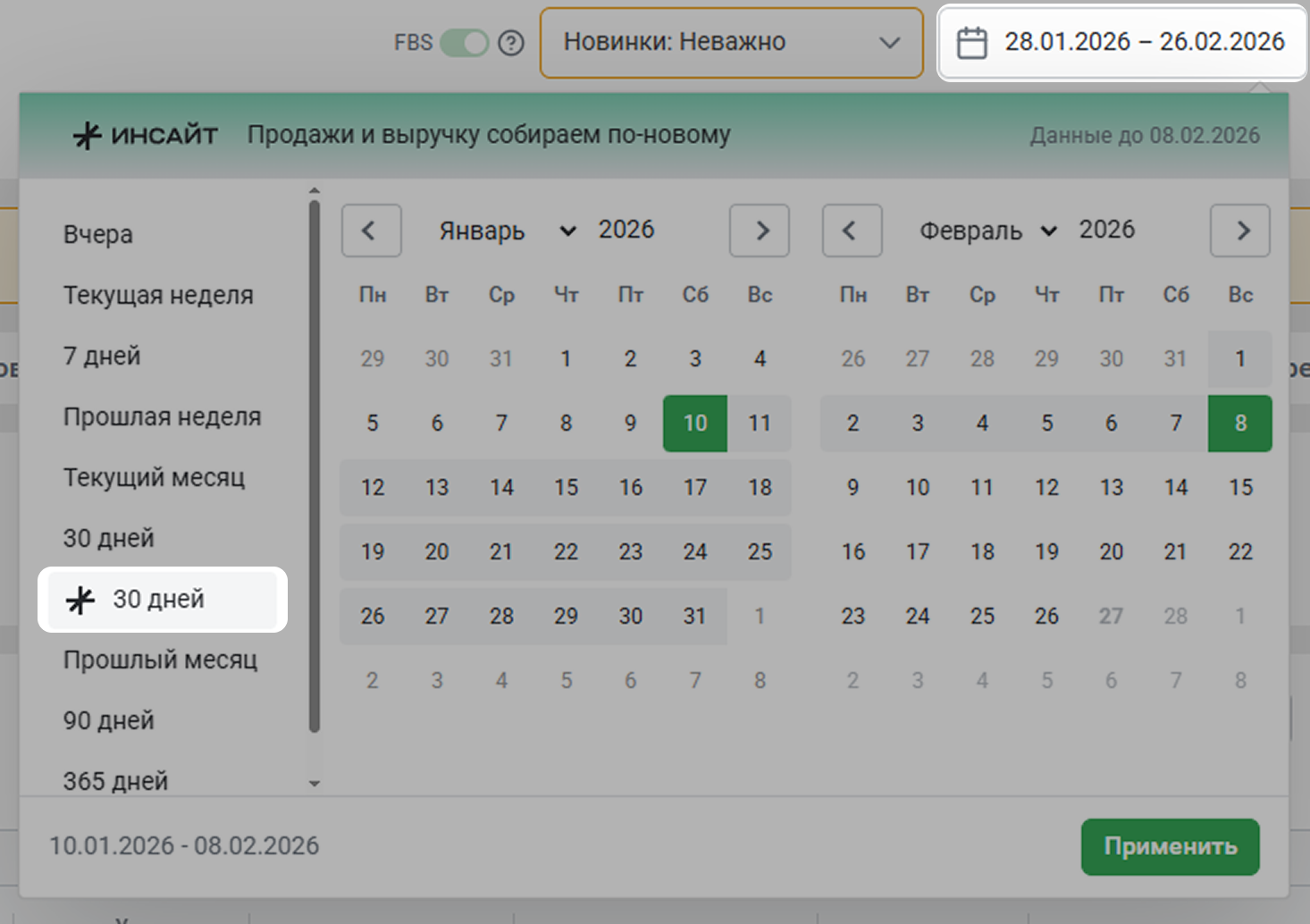Поэтому в календарях отчетов мы добавили вариант 30 дней со значком Инсайта – нажмите, чтобы посмотреть последние 30 дней, которые Инсайт успел обновить.