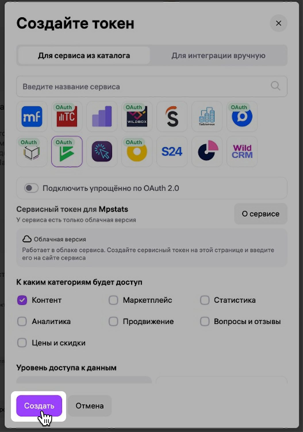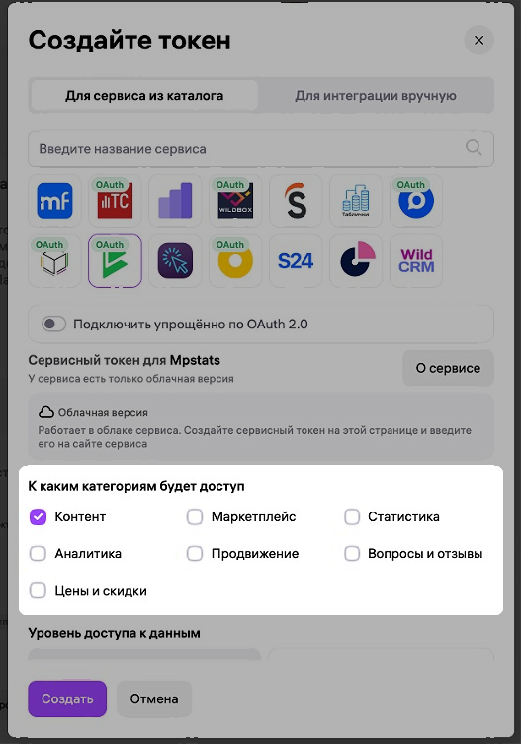 Во вкладке Для сервиса из каталога введите в строку поиска MPSTATS. Нажмите на иконку MPSTATS.