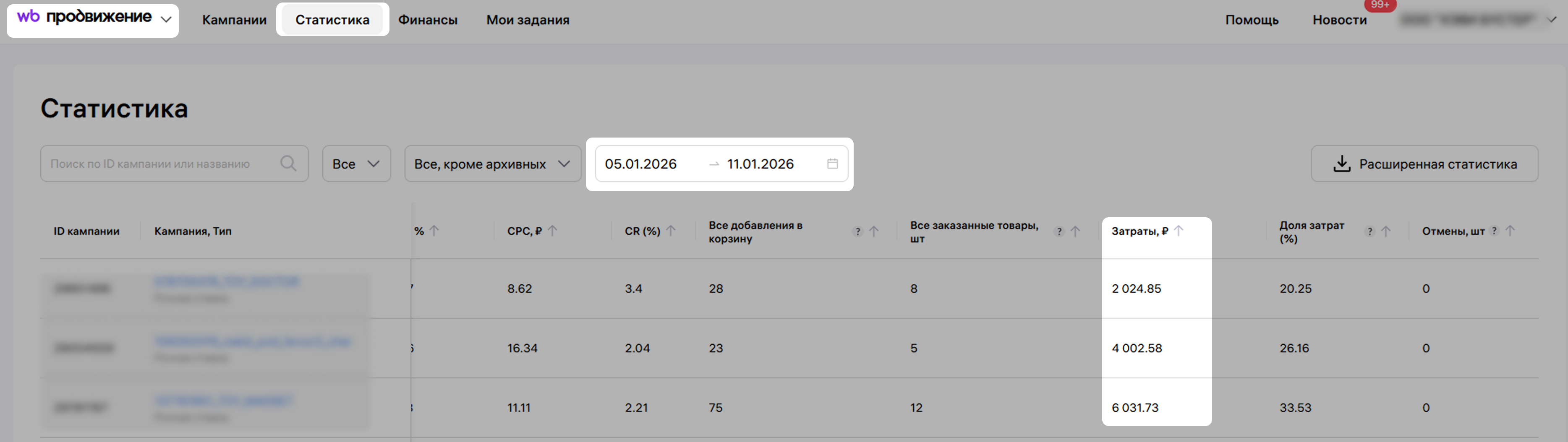 Расходы на рекламу не указаны в еженедельном отчете отдельно – они входят в статью Прочие удержания/выплаты. Но в Сводке они есть: мы берем их из отчета WB Продвижение → Статистика, столбец Затраты. Подробнее об этом рассказали в статье Почему реклама в Сводке и Товарах отличается от удержаний в еженедельном отчете?