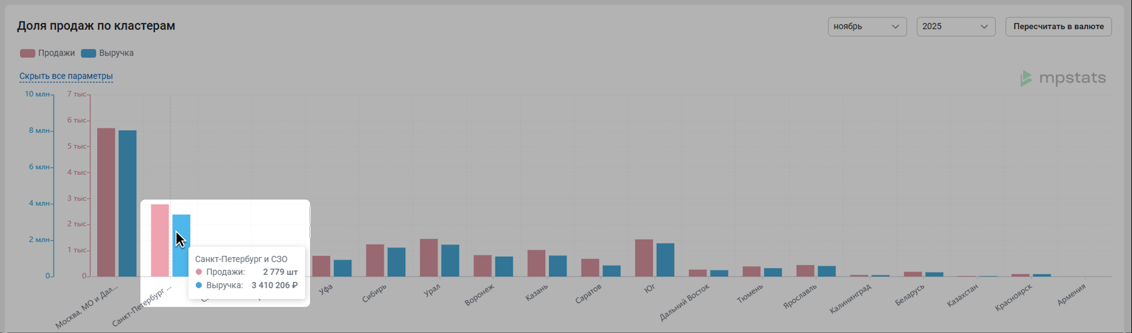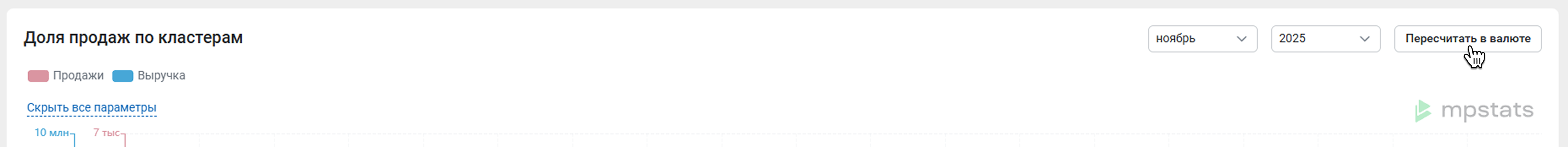 Данные для этого отчета мы собираем с апреля 2024 года. По умолчанию мы показываем данные за текущий месяц, но вы можете выбрать любой другой в выпадающем списке. Так можно сравнить, как менялся спрос в кластерах в разные месяцы.