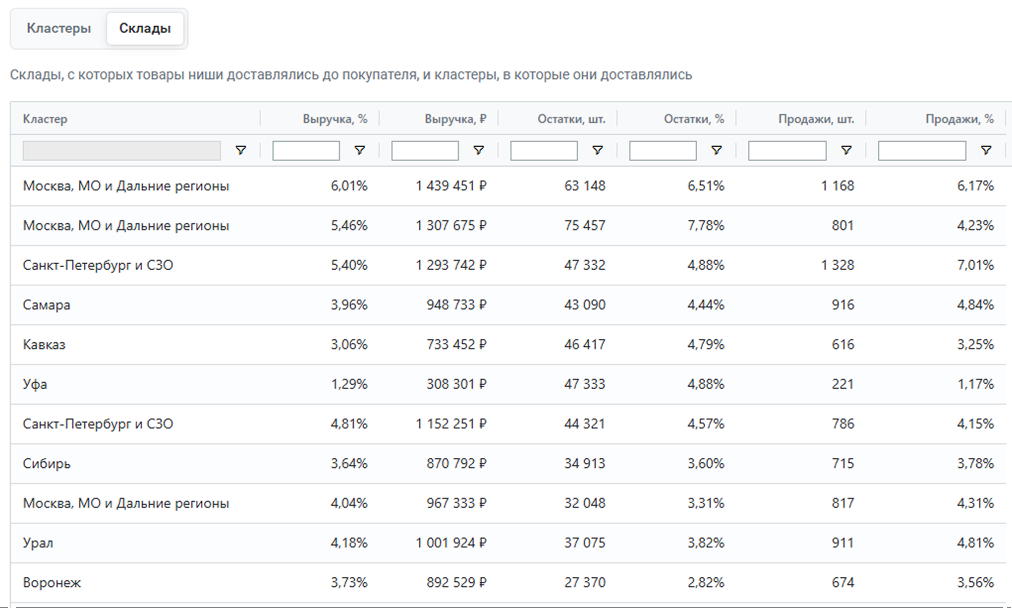 Во вкладке Склады вы найдете подробную информацию о складах, с которых товары предмета доставлялись до покупателя, и кластеры, в которые эти товары доставлялись.
