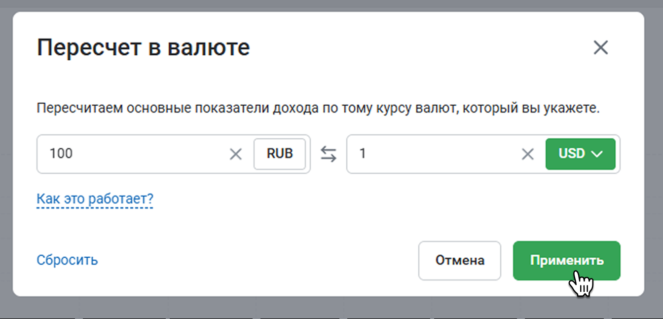 Например, сейчас выручка 10 000 ₽. Вы указываете, что 1 $ равен 100 ₽. Когда вы нажмете Применить, в таблице в графе Выручка будет 100.