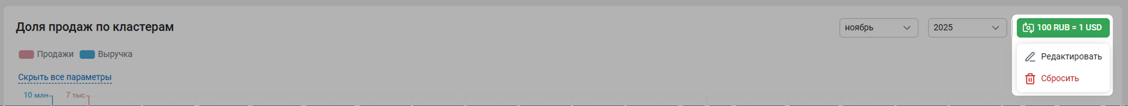 Указанный вами курс отобразится справа над таблицей. Если вы нажмете на него, откроется меню. Нажмите Редактировать, если нужно изменить курс и пересчитать показатели. Чтобы вернуть таблицу к изначальному виду, нажмите Сбросить.