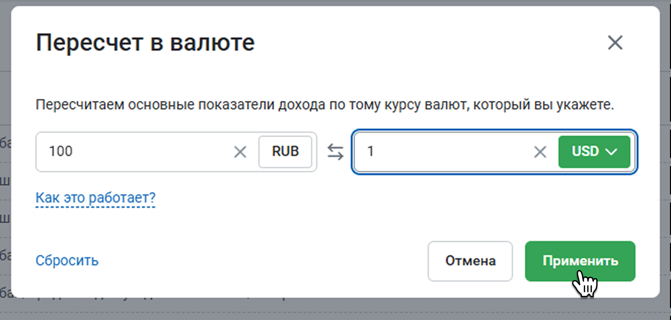 Например, сейчас выручка 10 000 ₽. Вы указываете, что 1 $ равен 100 ₽. Когда вы нажмете Применить, в таблице в графе Выручка будет 100.