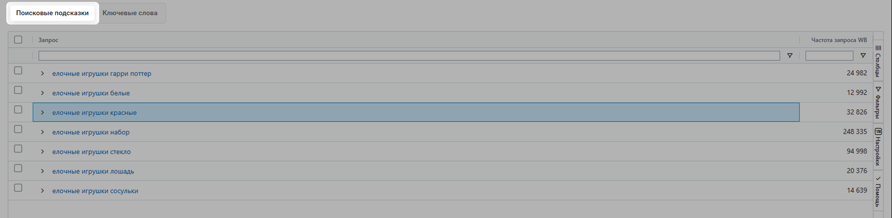 Система покажет поисковые подсказки первого уровня вложенности. Для каждой подсказки показываем Частоту запроса WB – сколько раз пользователи маркетплейса вводили такой запрос за 30 дней.