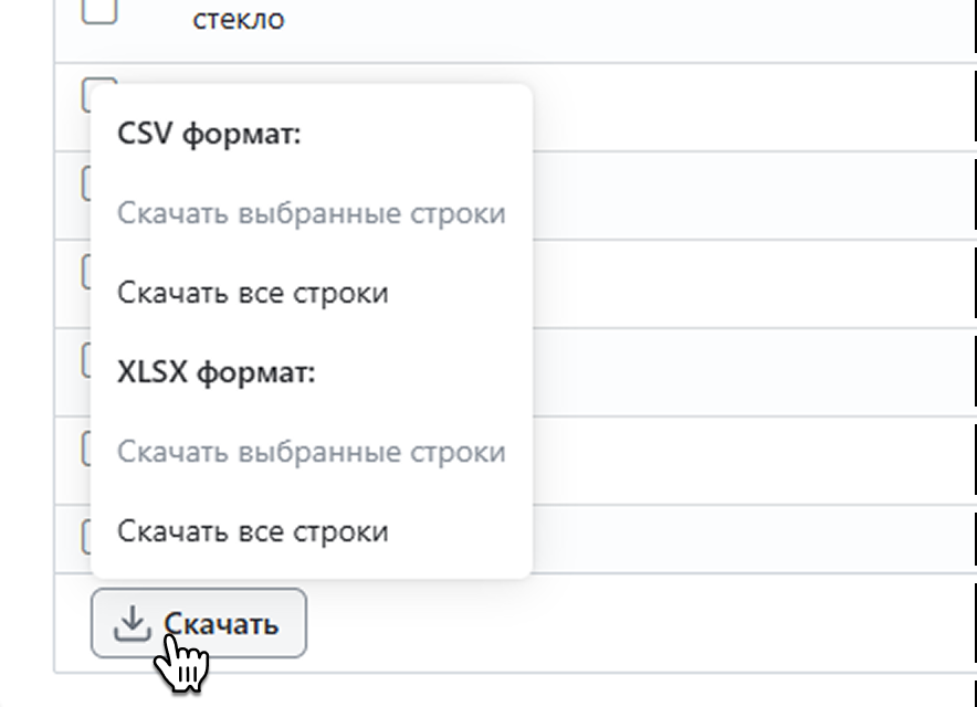 Вы можете загрузить для дальнейшей работы и подсказки, и ключевые слова. Отметьте нужные слова или подсказки галочками и нажмите Скачать. Выберите формат – XLSX или CSV. Выберите, загружать все строки или только отмеченные галочками.