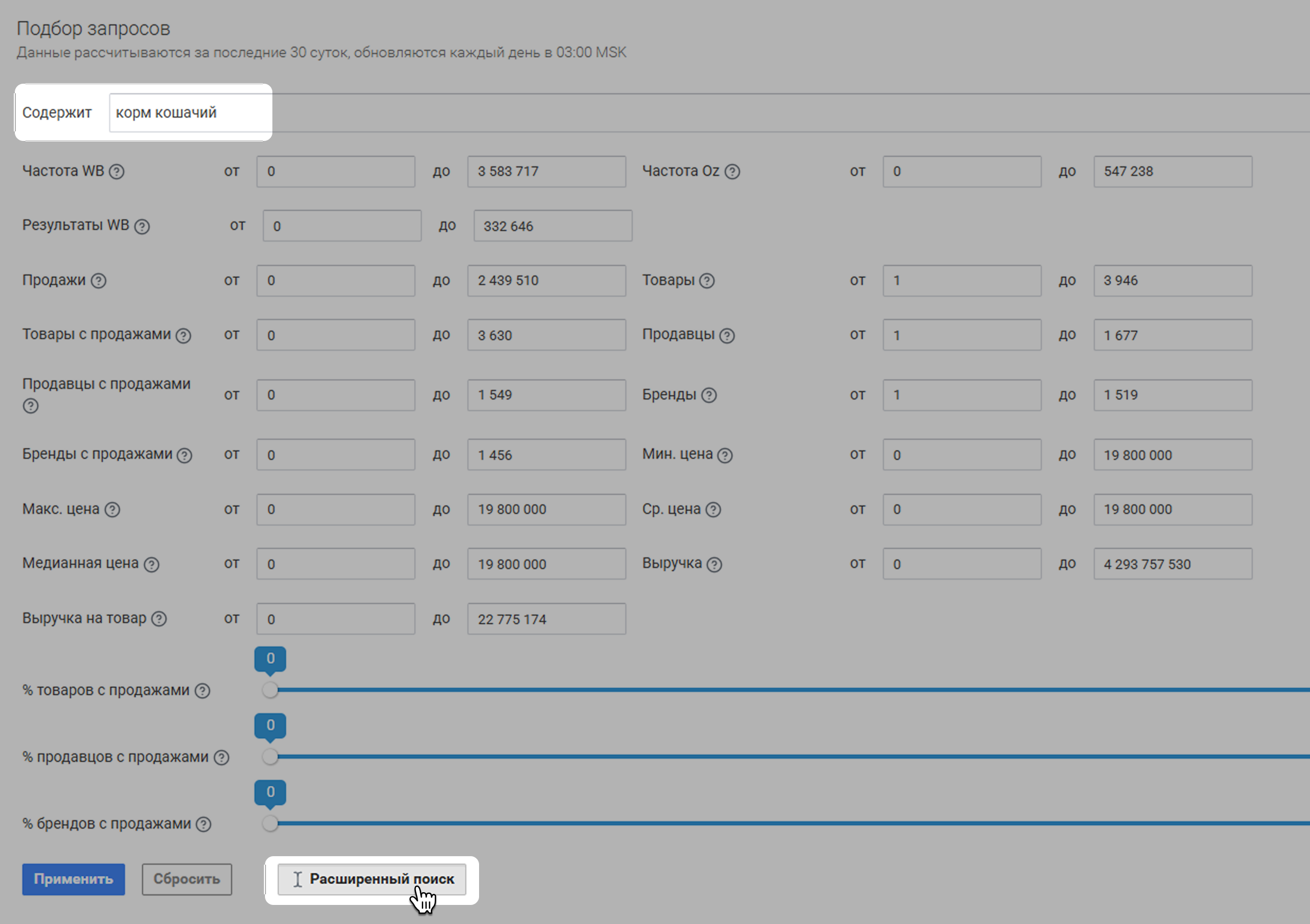 На странице инструмента введите анализируемый поисковый запрос или ключевое слово в поле Содержит и установите желаемые критерии. Чтобы увидеть больше параметров, нажмите на Расширенный поиск.