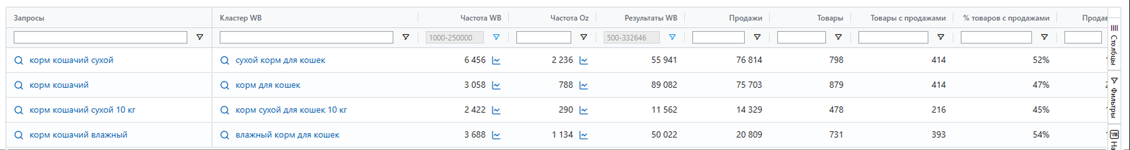 В таблице показана информация по каждому релевантному запросу, где в каждой колонке содержатся данные по выбранным ранее критериям.