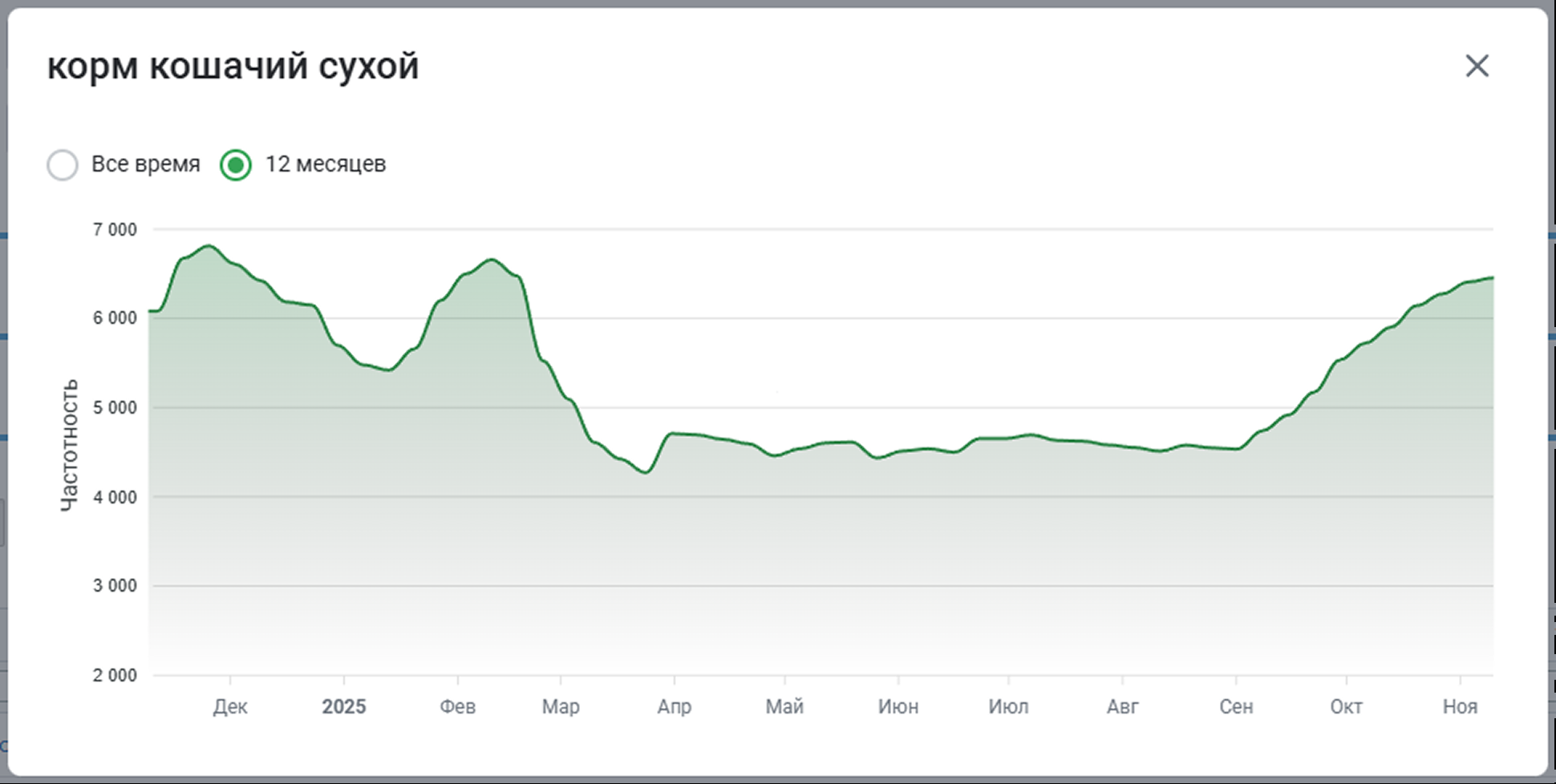 Если вы нажмете на значок графика в колонке Частота WB, откроется график изменения частотности.