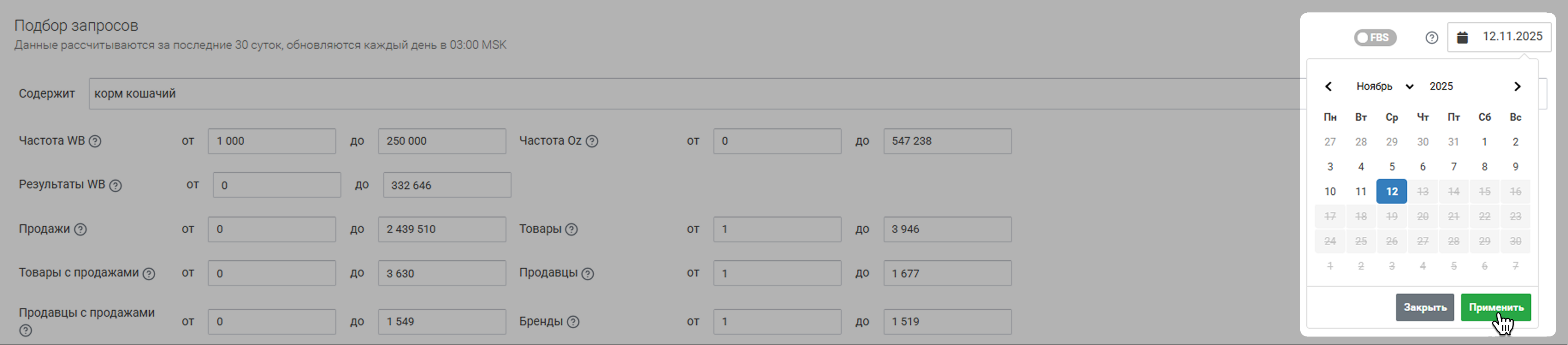Можно выбрать период, за который вы хотите проанализировать запросы. Для этого нажмите на значок календаря. Данные будут собраны за предыдущие 30 дней до указанной даты. Самая ранняя дата – 19.07.2021.
