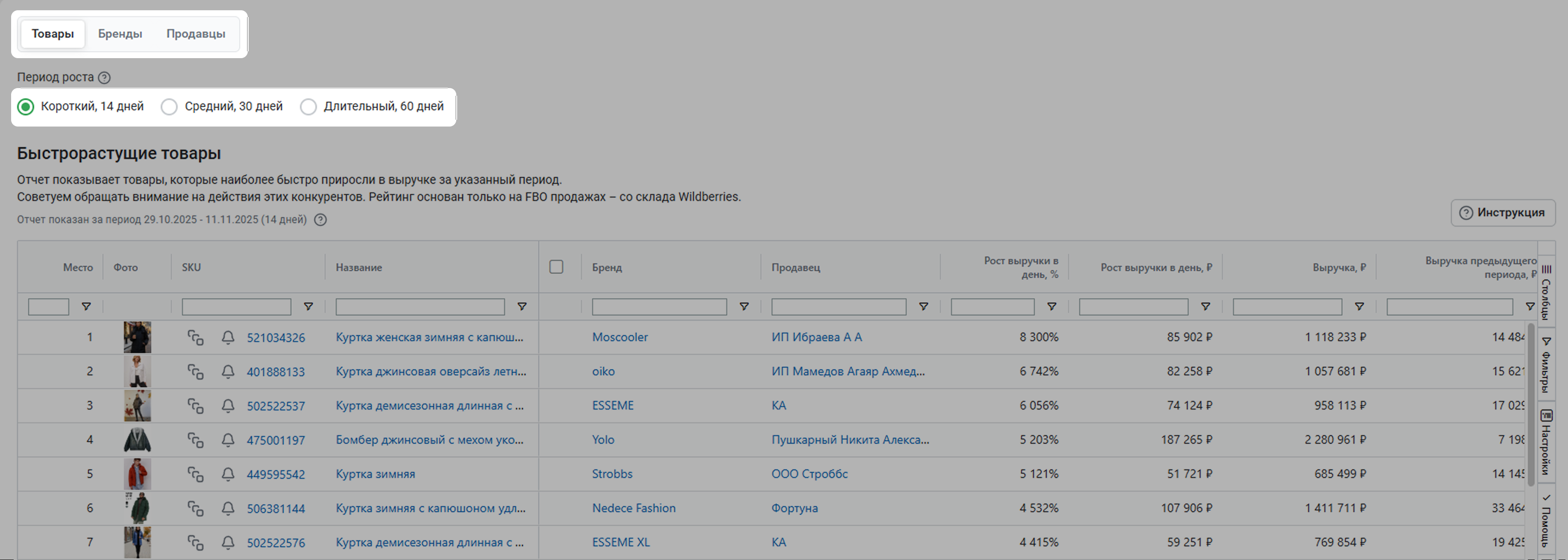 Отчет Быстрорастущие конкуренты поможет увидеть потенциально опасных конкурентов: тех, кто быстрее всего прирастает в основных показателях – продажах и выручке. А еще товары, у которых был быстрый рост. Обращать внимание на таких конкурентов и товары полезно, потому что такие игроки могут выйти в топ.