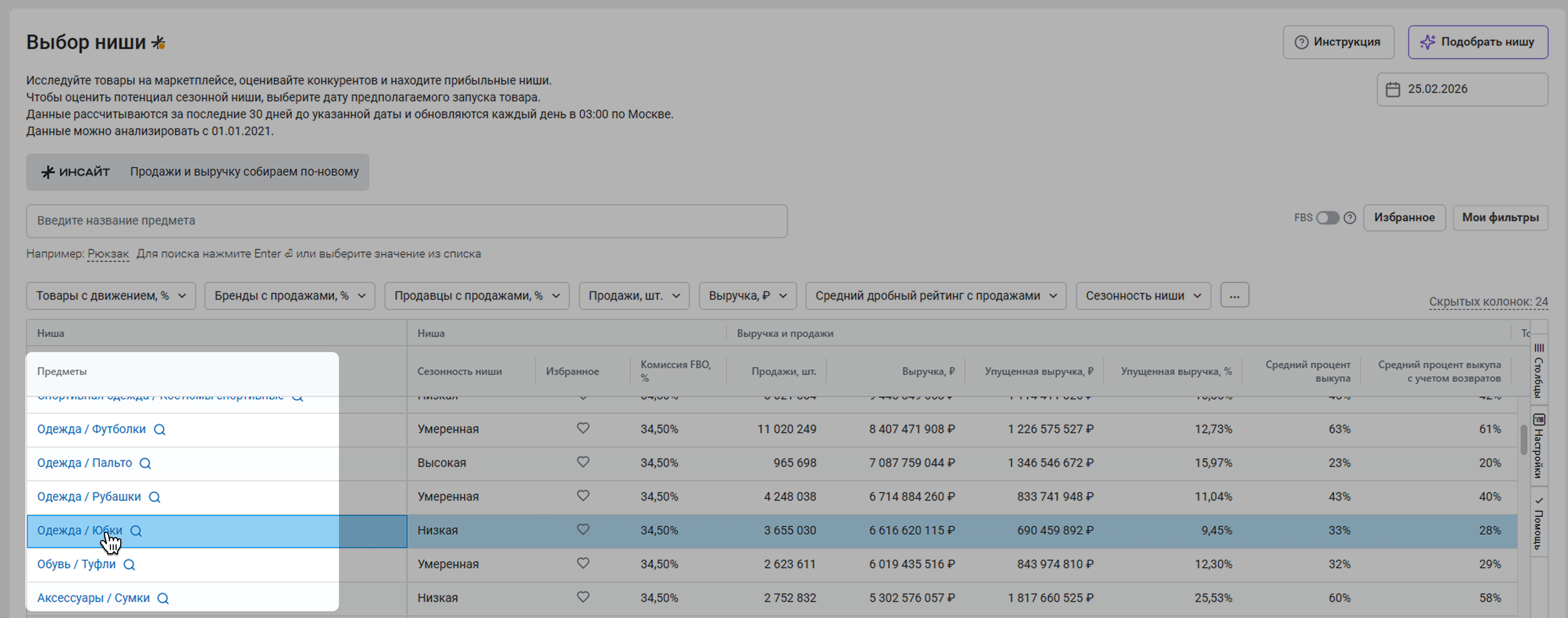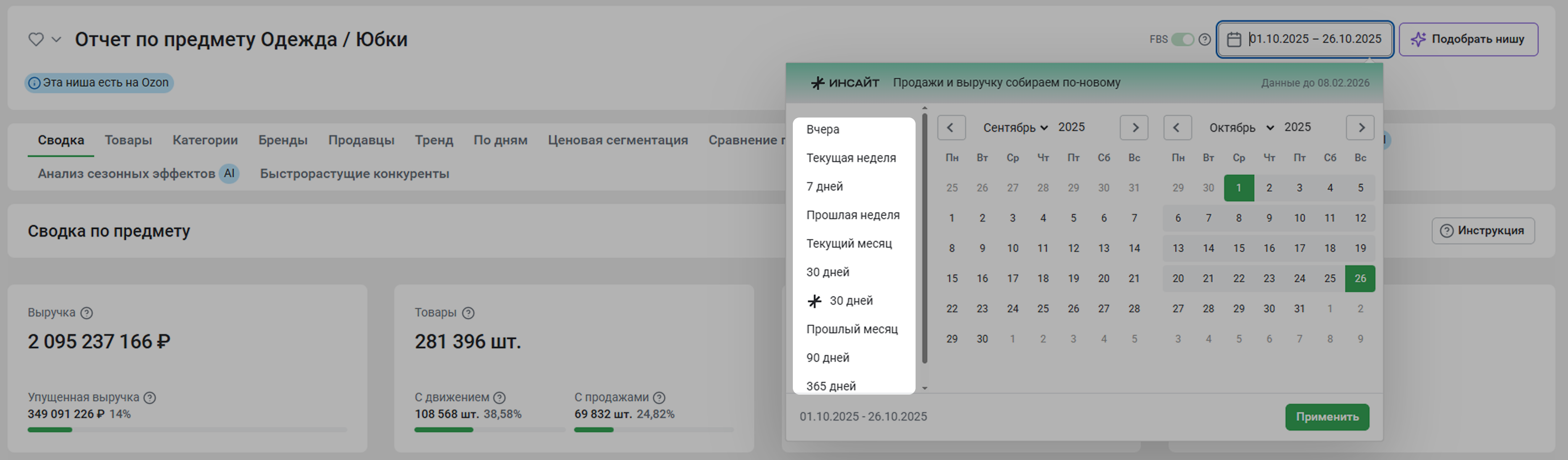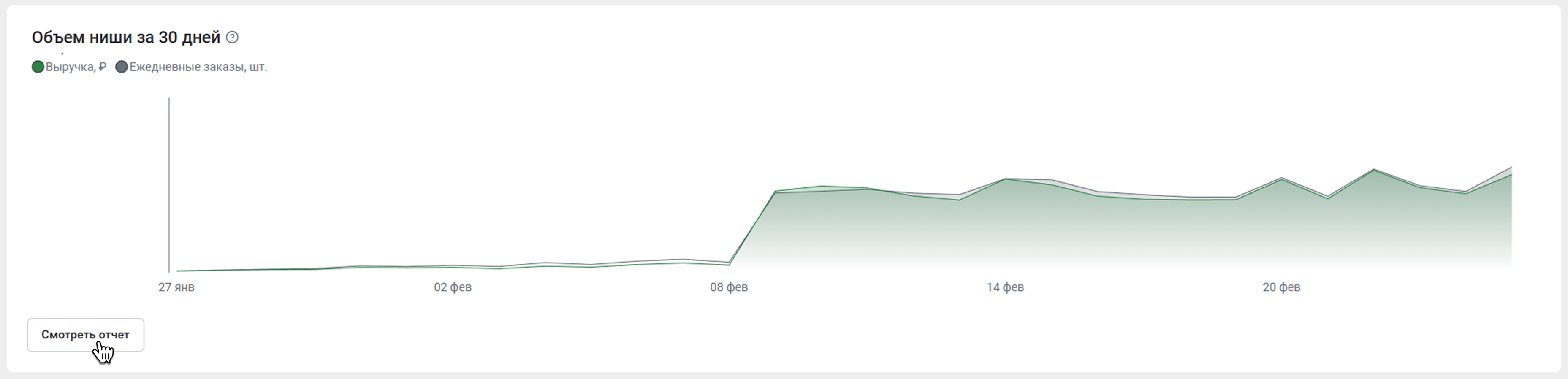 Если вы нажмете Смотреть отчет, откроется вкладка Тренды. Отчет позволяет более детально рассмотреть динамику выручки и продаж, на основании которой можно отслеживать динамику развития рынка в выбранной категории. Более подробно об этом отчете можно прочитать в статье Тренд.