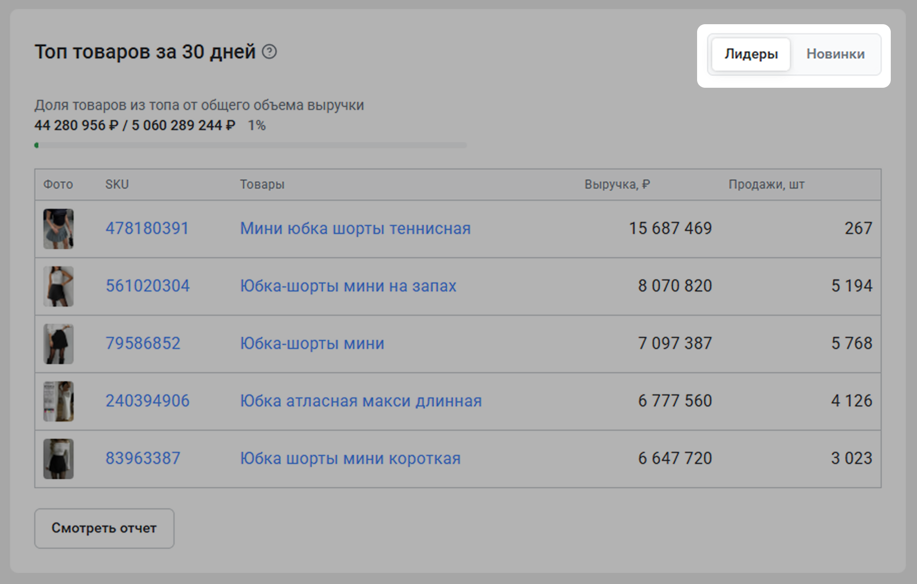 Покажет список новинок и лидеров по продажам и выручке среди общего объема выручки. Вы увидите, в каком количестве продавались какие товары и какая у каждого была выручка. Можно переключаться между лидерами и новинками.