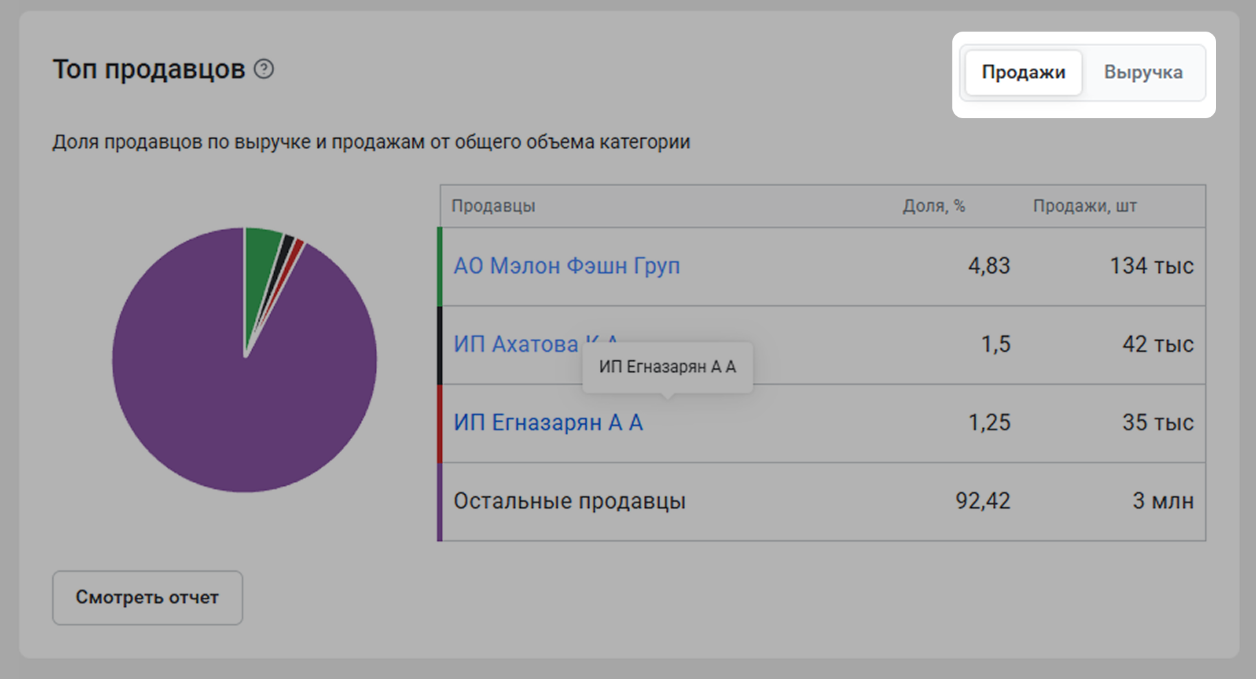 Если вы нажмете Смотреть отчет, откроется вкладка Продавцы. Там вы найдете 200 продавцов, у которых были продажи за последние 30 дней. Более подробно об этом отчете вы можете прочитать в статье Продавцы.