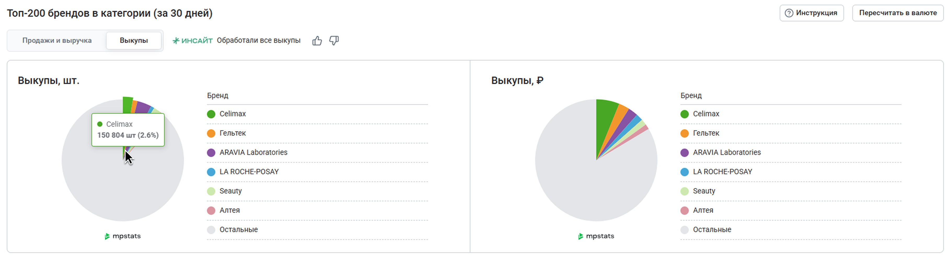 На диаграмме Выкупы показываем 6 брендов с наибольшим количеством и суммой выкупов. Данные для этих диаграмм обработаны по методу Инсайт – подробнее рассказали в статье Метод обработки данных Инсайт.