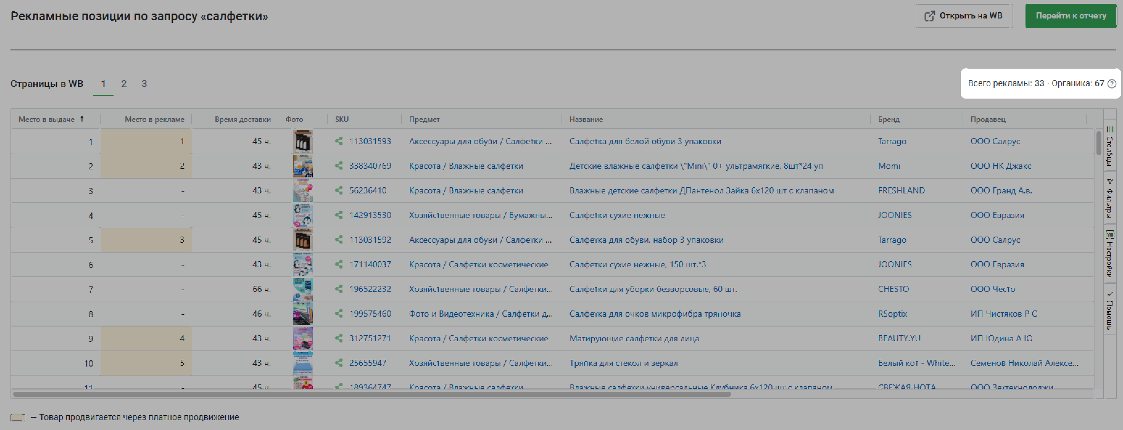 В таблице вы найдете подробную информацию по товарам в выдаче. В правом верхнем углу показываем, сколько на первой странице рекламных карточек, а сколько – органических.