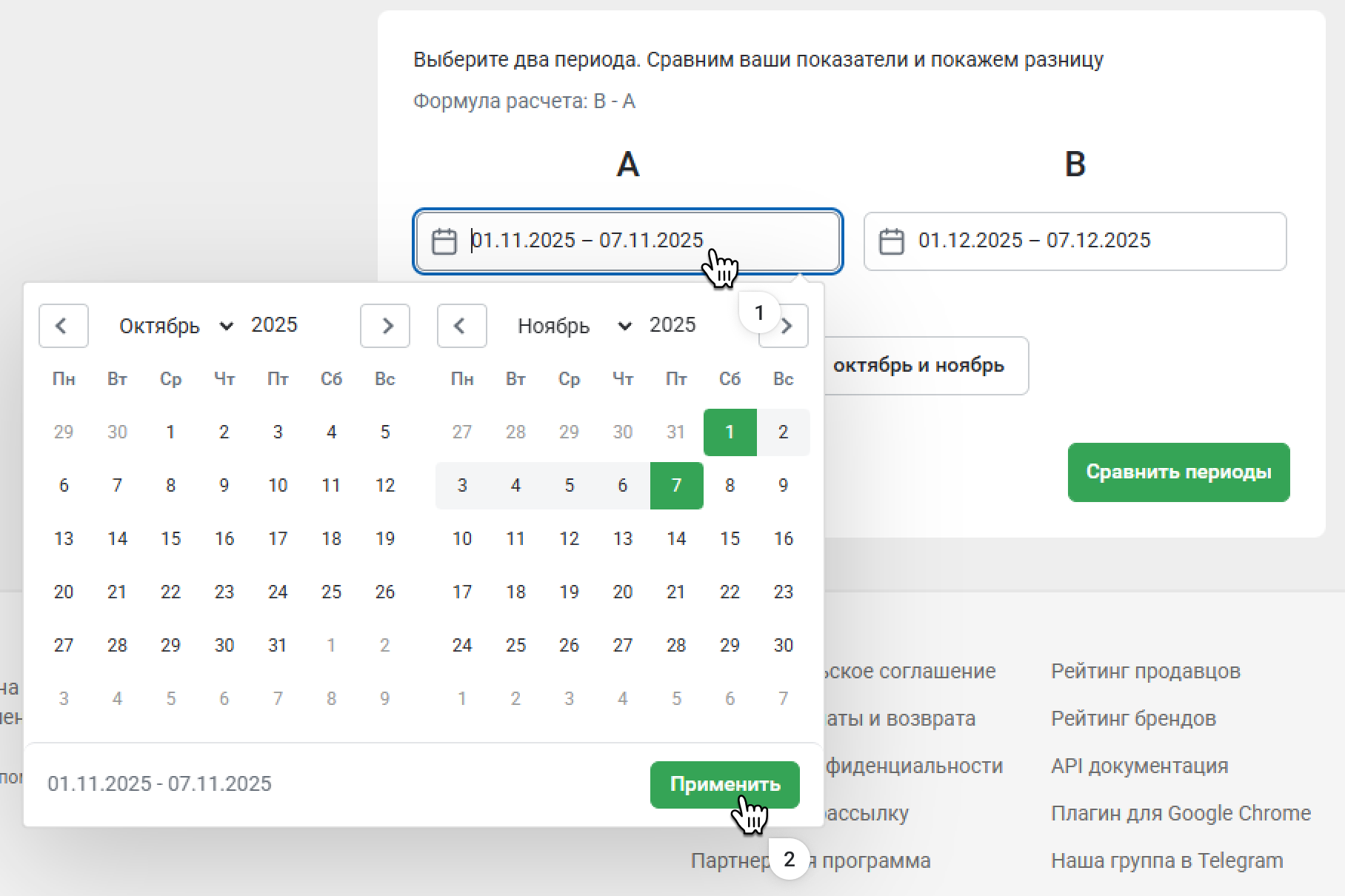 Например, вы хотите оценить, как участие в акции повлияло на количество заказов. Выберите период, когда была применена акция, и период без акции. Сервис одновременно покажет данные по этим периодам.