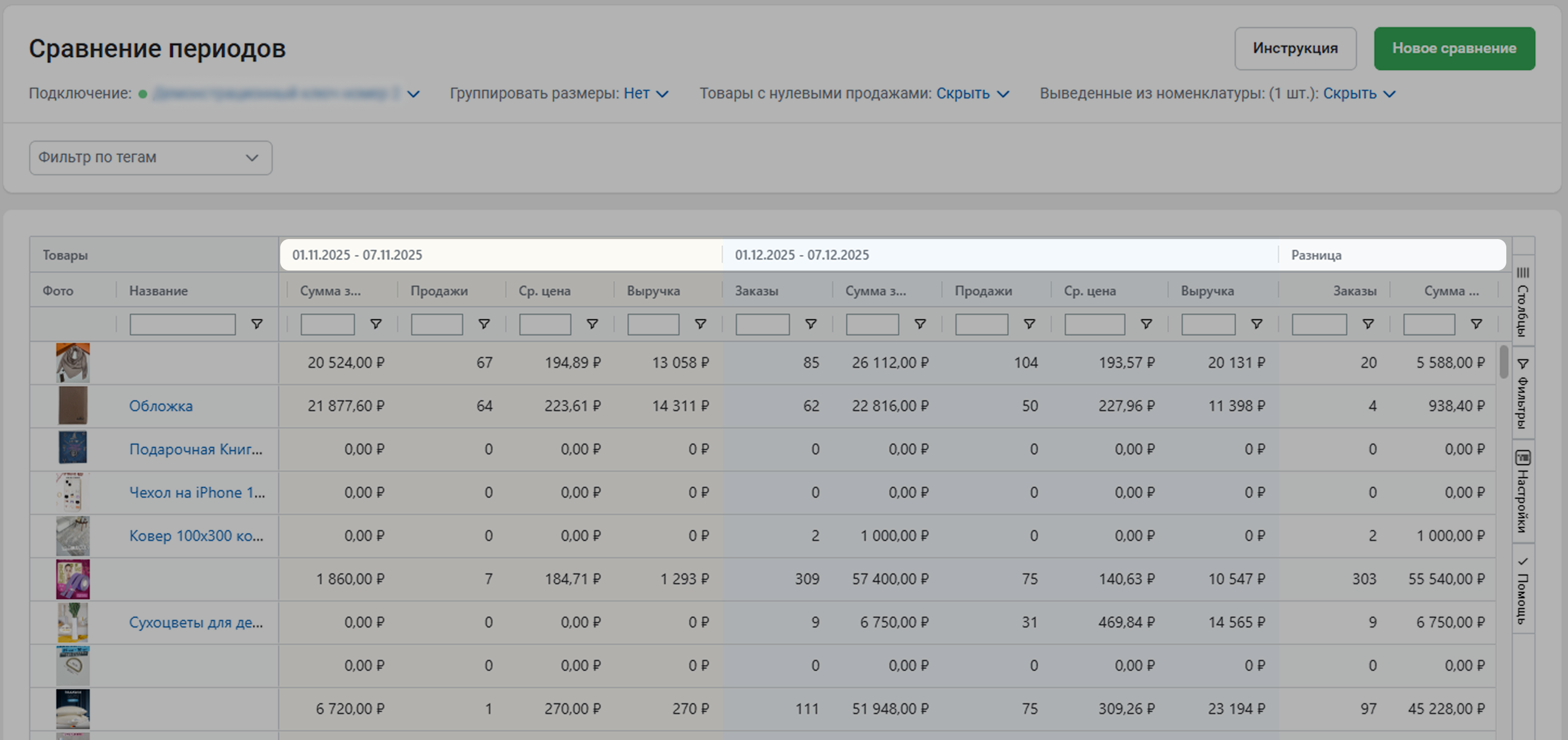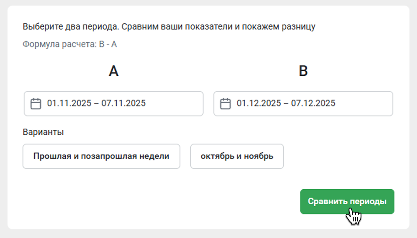 Инструмент Сравнение периодов сопоставляет два периода и показывает разницу между ними. С его помощью удобно анализировать влияние распродажи, оценивать эффект от подключения рекламы или проверять новые стратегии продаж.