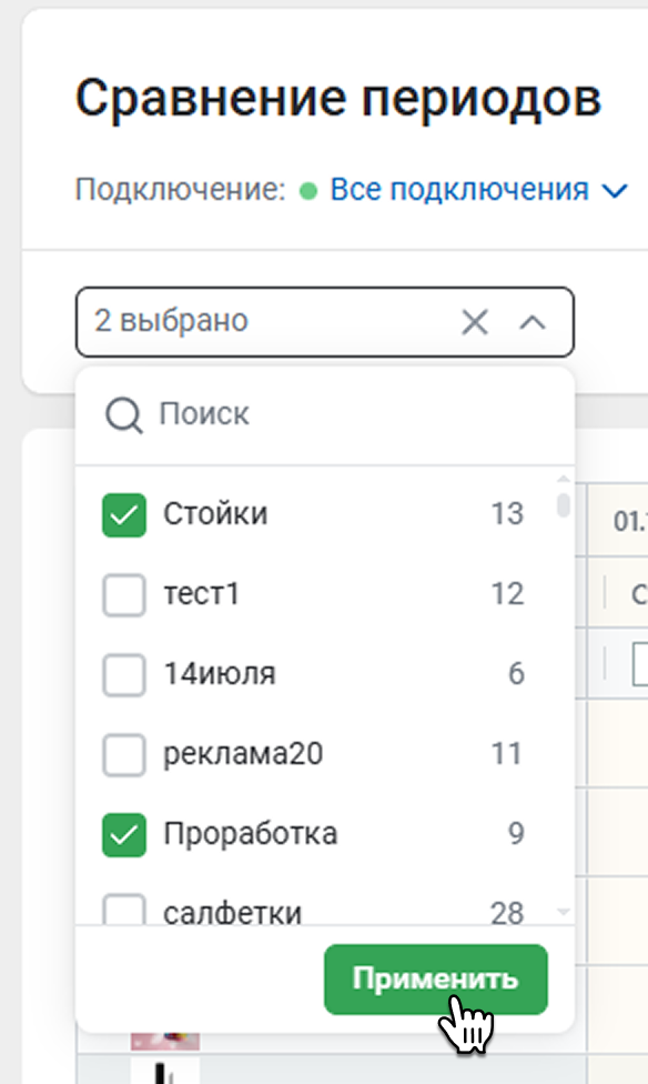 Вы можете выбрать конкретное подключение, по которому хотите видеть сравнительный отчет. Для этого в поле Все подключения отметьте галочкой нужное подключение и нажмите Обновить.